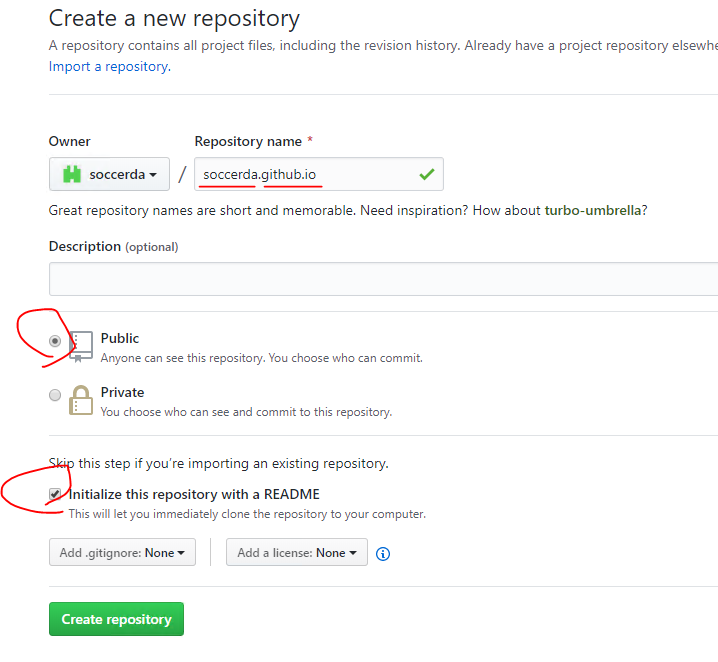 두 번째 Repository name에 반드시 계정 ID + ".github.io" 입력 그리고 Initialize this repository with a README 체크