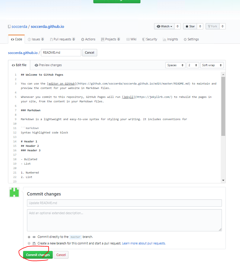 테를 선택하면 편집창이 나타나고 하단에 Commit changes를 입력할 수 있다. 입력한다.