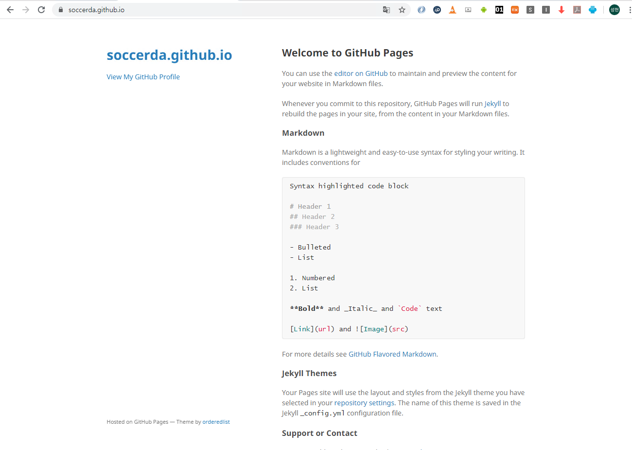 계정 ID + ".github.io"로 웹브라우저로 접속하면 페이지가 만들어진 것을 확인할 수 있다.