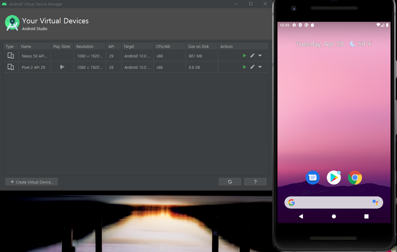 만약 없다면 아래 Create Virtual Device를 클릭하여 에뮬레이터를 추가하자