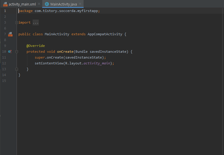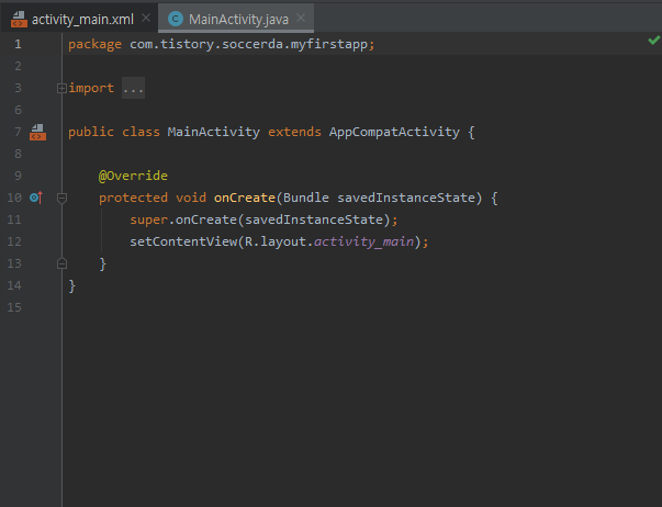 작업 영역을 보면 파일이 activity_main.xml과 MainActivity.java 가 보이는데
