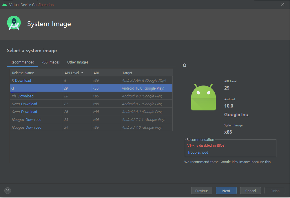 안드로이드 버전을 선택해준다. 최신 10.0을 권장