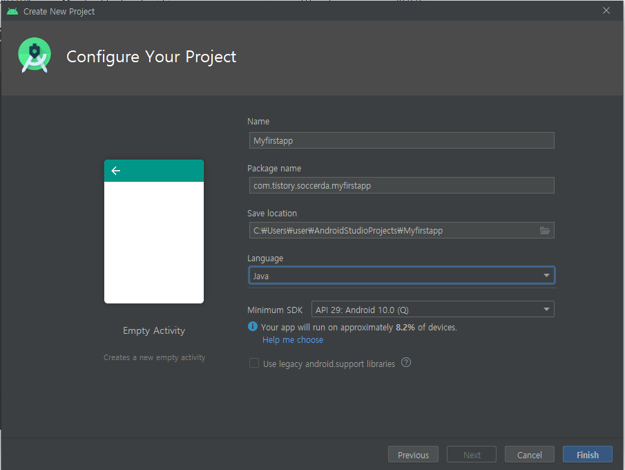 여기서 Empty Activity(빈 화면)를 선택하고 Next!