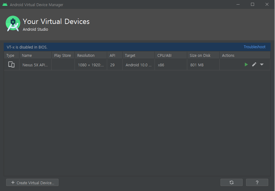 디바이스 목록 상단에 VT-x is disabled in BIOS. Troubleshoot라는 문구가 보인다.