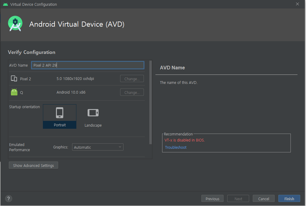 "Intel HAXM is required to run this AVD. VT-x is disabled in BIOS."라는 메시지가 뜨면 가상화 설정이 비활성화되어 있어 이를 활성화시켜줘야 한다.