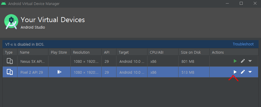 에뮬레이터를 실행하려면 원하는 에뮬레이터의 Actions의 재생 버튼을 클릭하면 실행된다.