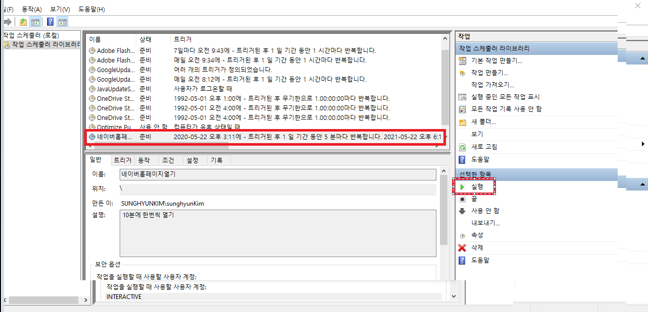 드디어 작업 스케줄러 목록에 추가한 스케줄이 보인다.