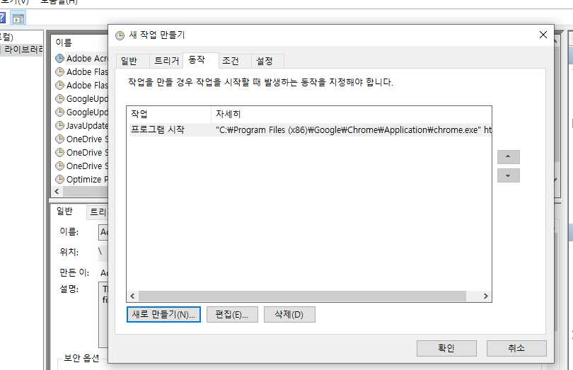 동작 탭에서 실행할 배치 프로그램을 설정하자