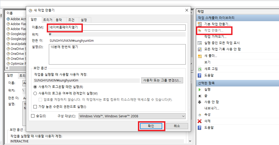 우선 일반 탭에 이름을 작성하고 사용자 계정을 선택하자 나는 일과시간에만 돌릴 생각이기에 사용자가 로그온 할 때만 실행을 선택하였다.