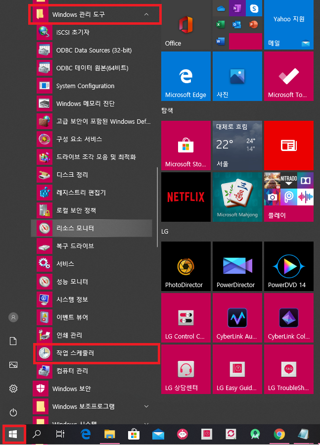 1. 좌측 하단 시작메뉴->Windows 관리 도구->작업 스케줄러