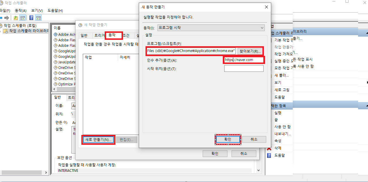 크롬 브라우저에서 네이버를 실행하려고 하면 프로그램/스크립트에 크롬이 설치되어 있는 경로에서 크롬 실행파일을 선택하고 인수 추가(옵션)(A)에 네이버 url을 넣는다.