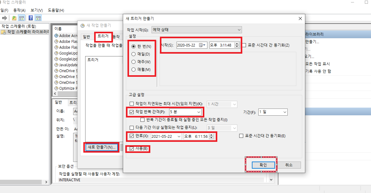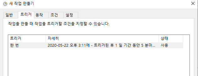 트리거 탭에서 주기와 시작 시간 반복 간격 만료시간 사용 여부를 설정하자