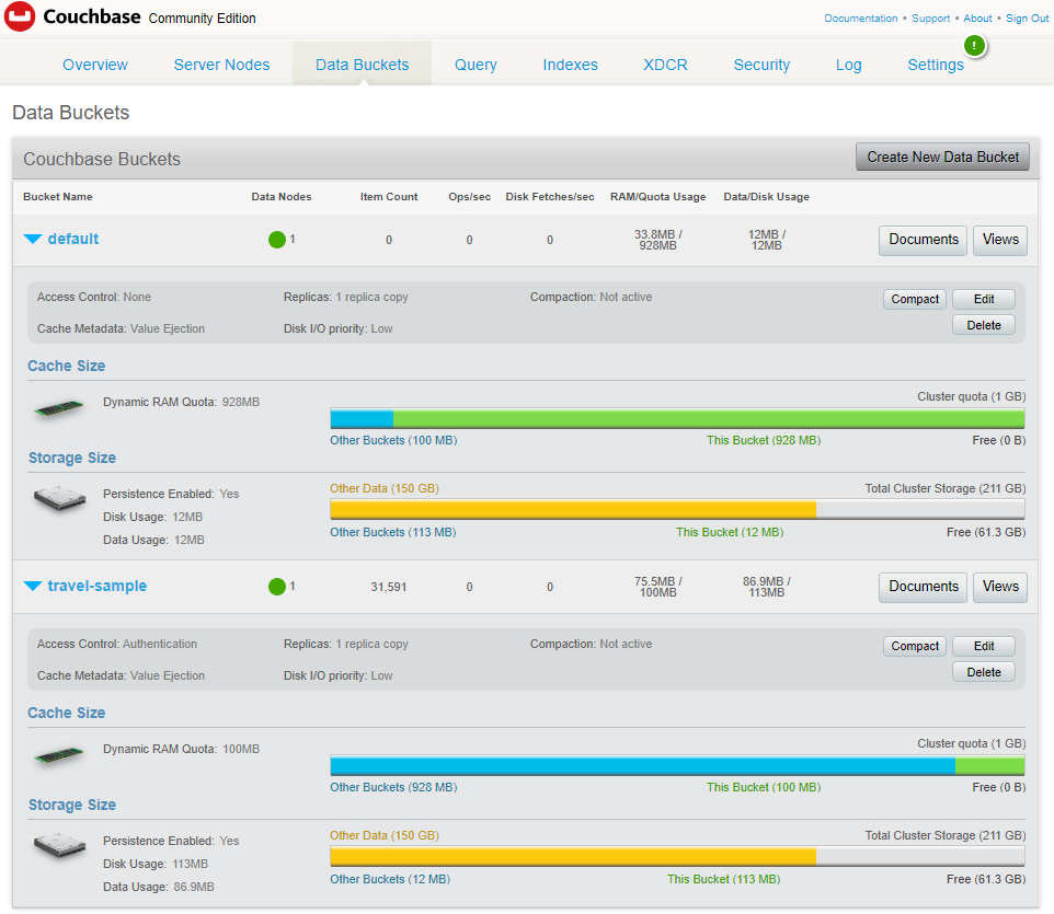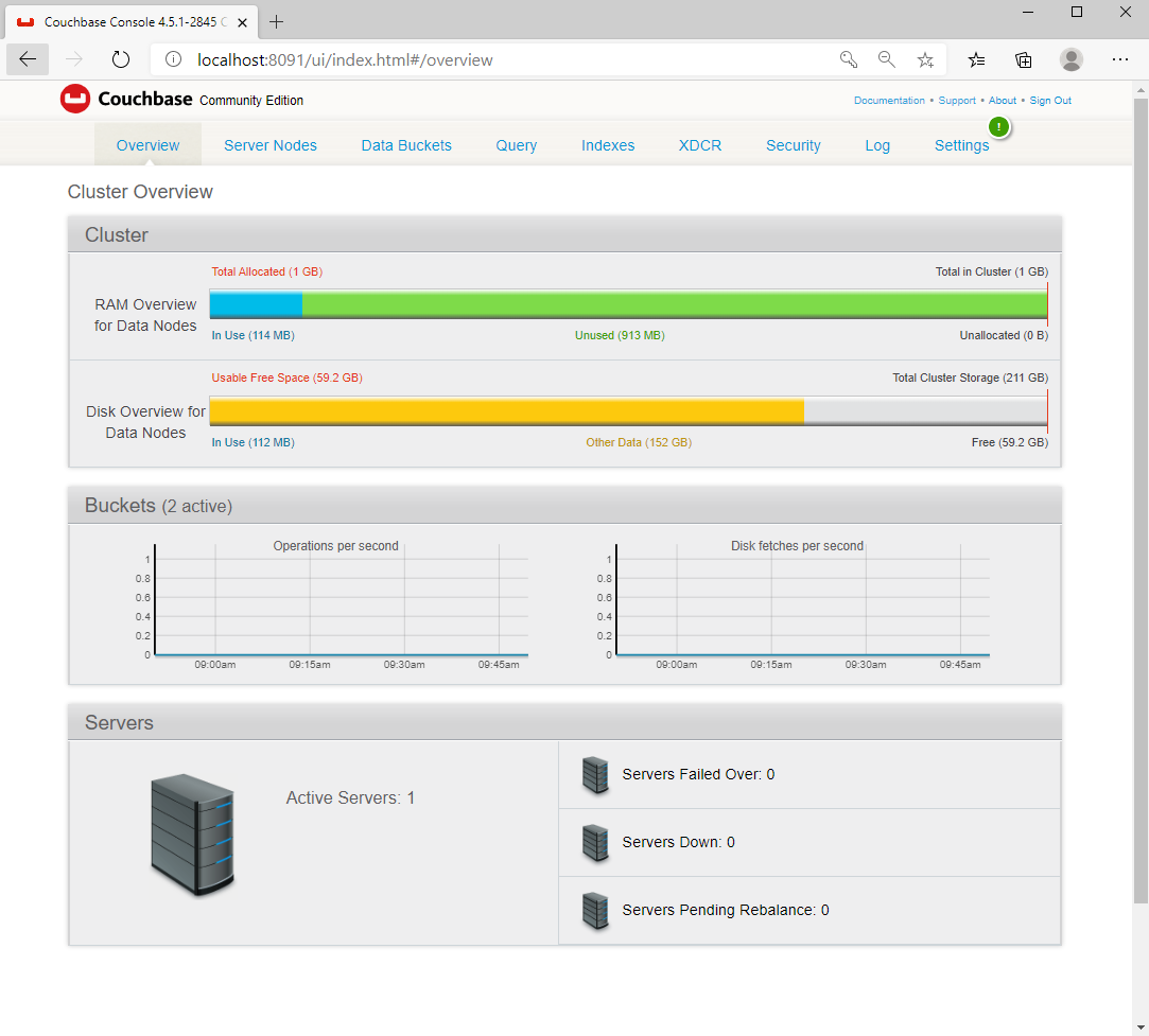Couchbase Console에서 GUI 타입의 관리 도구 통해 시스템 정보와 카우치 데이터를 확인할 수 있다.