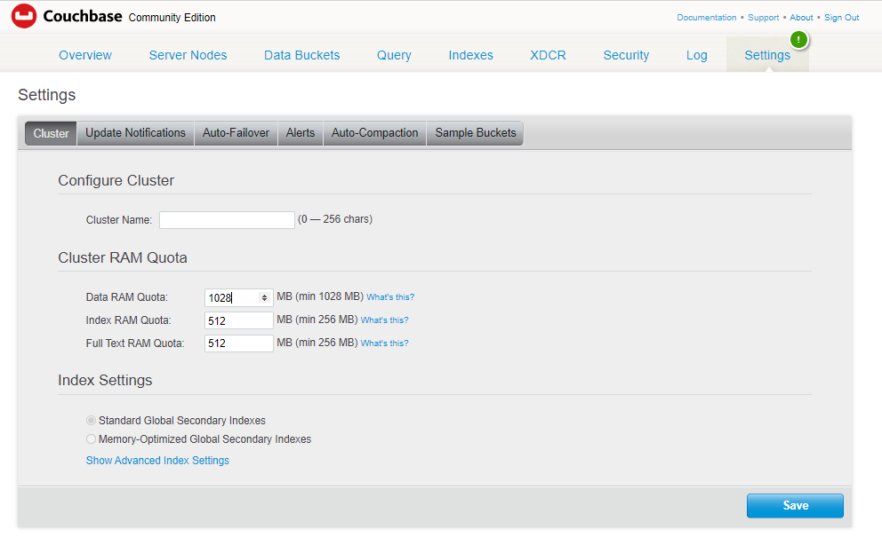 Settings 탭에서는 Cluster 관련 설정과 카우치베이스 버전 업데이트 정보, Auto Fail Over 설정, 그리고 장애에 대한 메일 보고를 받을 설정 등의 기존 설정 정보를 변경할 수 있다.