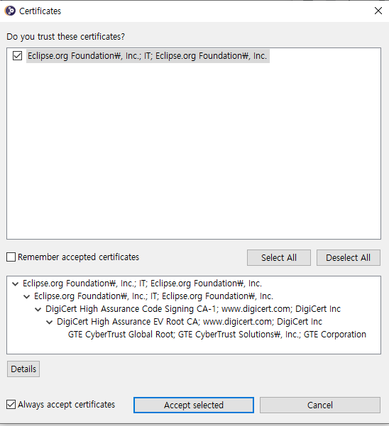 이클립스 인증에 동의(Accept)해야 한다.
