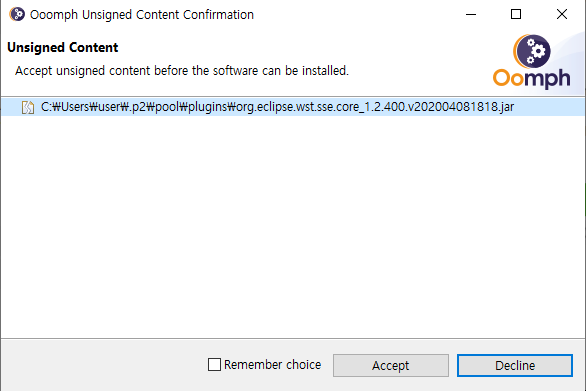 서명하지 않은 설치건에 대해서 동의(accept)하고 설치
