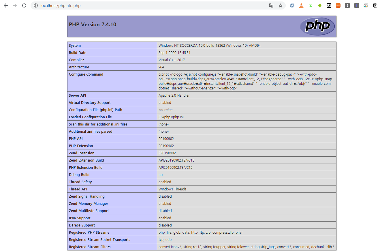 아래와 같이 php 정보가 출력되면 정상적으로 연동된 것이다.